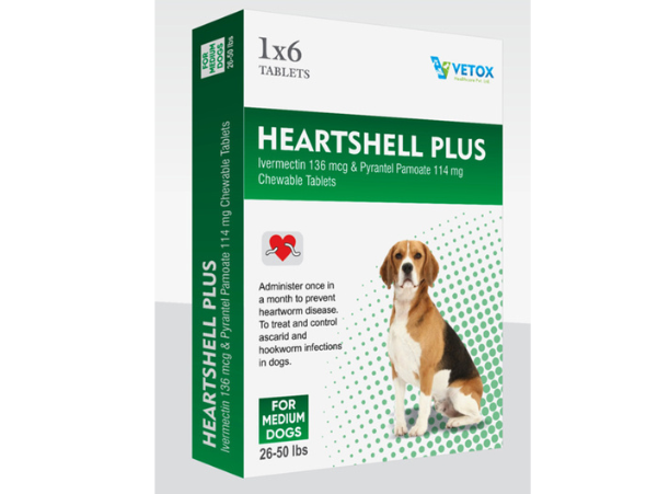Heartshell Plus chewable tablets for use in Dogs to prevent canine heartworm disease by eliminating heartworm larvae and for the treatment and control of roundworms and hookworms.